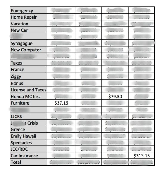 Both the Car Insurance and Honda Motorcycle Insurance totals are relatively low in the above spreadsheet because we pay those bills yearly in June, and we have not yet rebuilt those accounts.