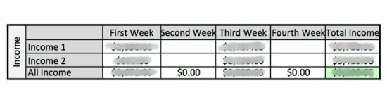 This is the simplest part of filling out our spreadsheet. My husband (Income 1) gets paid on the 1st and 15th of the month. When his paycheck clears, I type in the amount in the corresponding week.