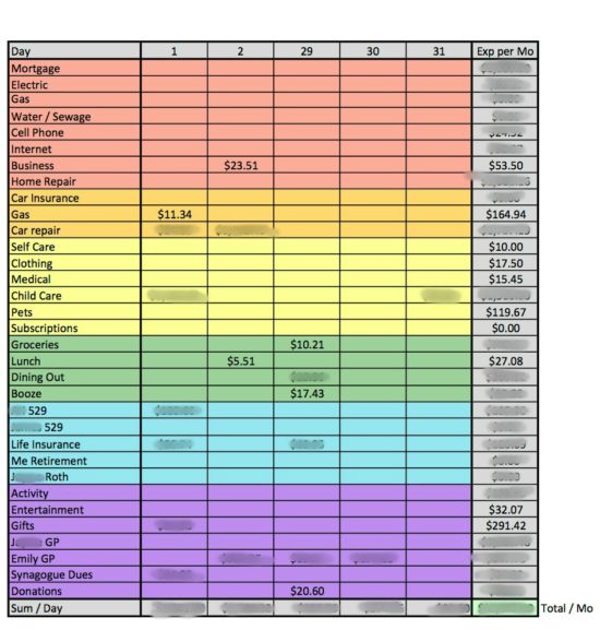The rest of the week, it generally takes me less than 10 minutes per day to log into our checking accounts and our credit card account to update the spreadsheet and make sure everything is balanced.