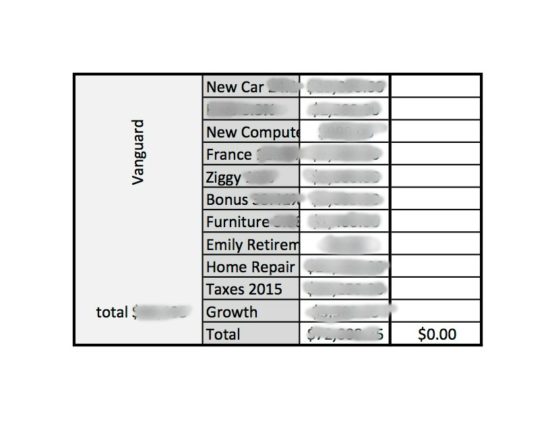 So, we opened up a Vanguard account and transferred money from any CO360 account that I did not anticipate us needing within the next year to two years. That included New Car, New Computer, our someday dream trip to France, my husband’s project car, which is playfully nicknamed Ziggy, money leftover from my husband’s most recent large Bonus, Furniture, and big-ticket Home Repair.