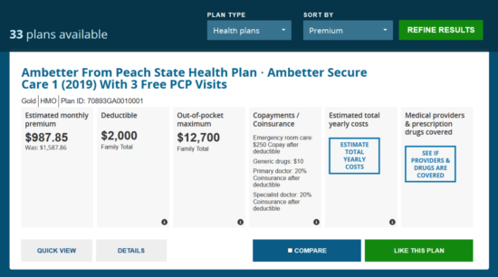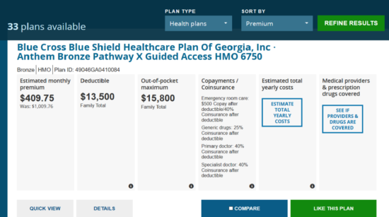 Now, let’s shift gears, and look at two plans from the health insurance exchange for Fulton County, Georgia.