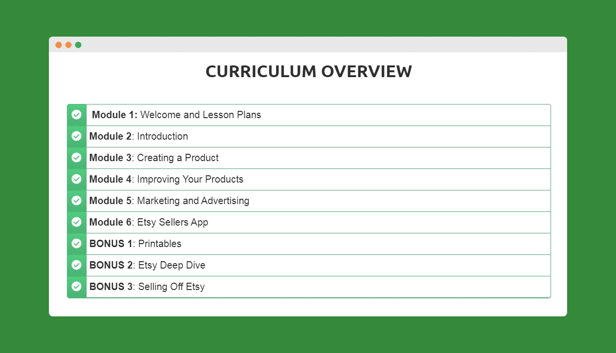 The course features six modules that come with video lessons and readable content. There are also 13 bonuses thrown in from expert printables experts. There are printable lesson plans to help guide you towards creating printable products that will sell.