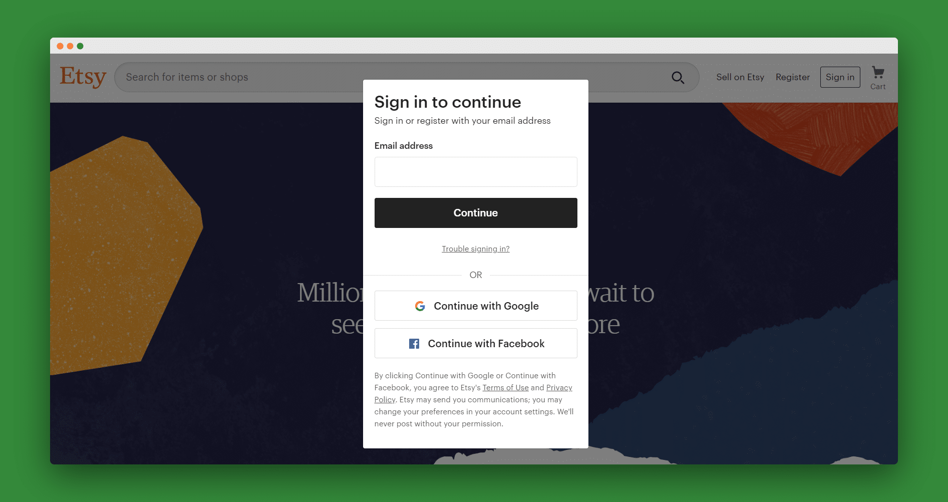 Signing up to be an Etsy seller is easy. Simply click on “Sell on Etsy” and enter your email address, name, and pick a password. Once you confirm your email address, you are ready to set up your own Etsy shop.