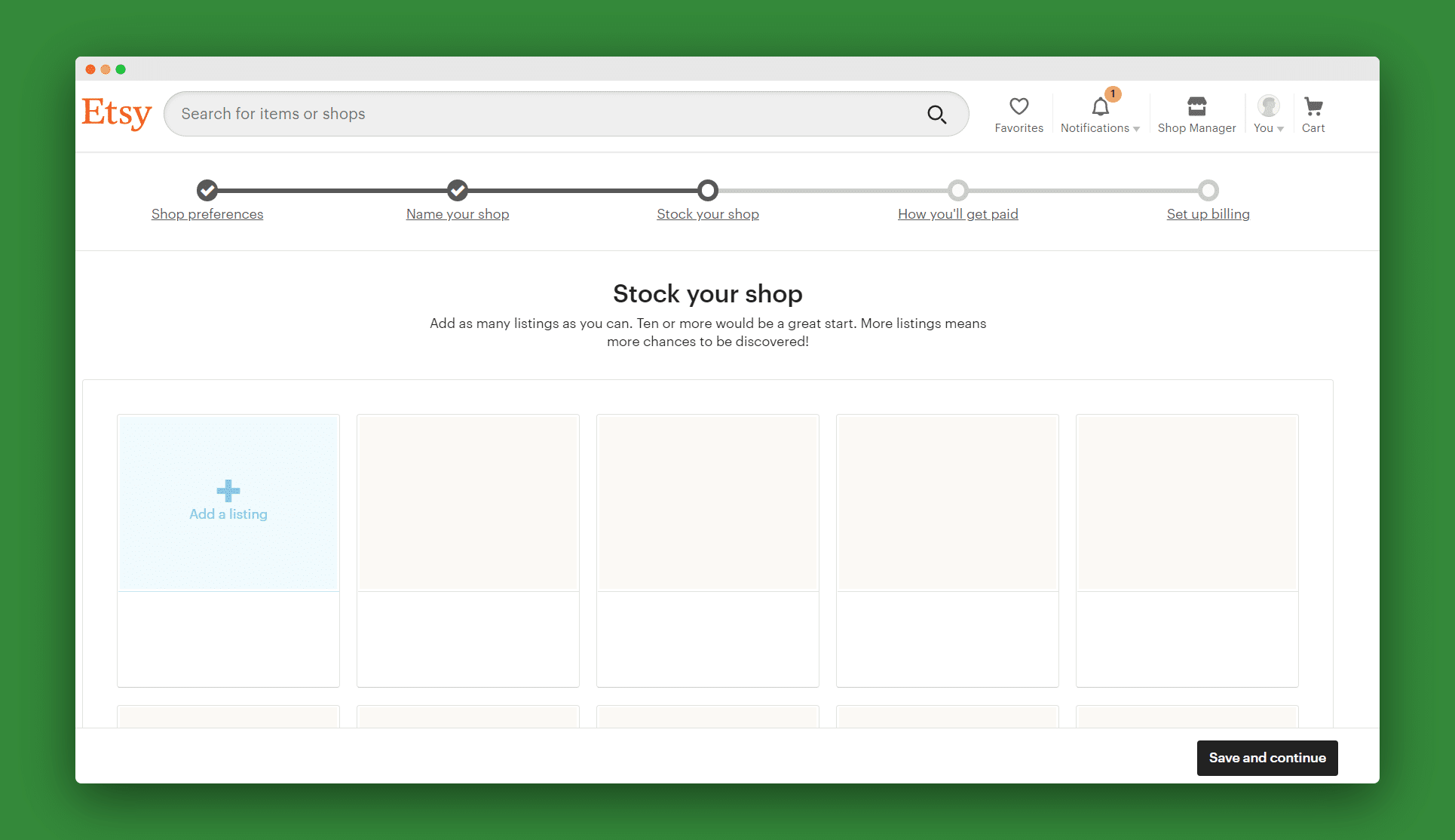 You can set up your own Etsy store in minutes. What’s involved in setting it up? Once you’ve set up a seller account, Etsy will walk you through this setup process: