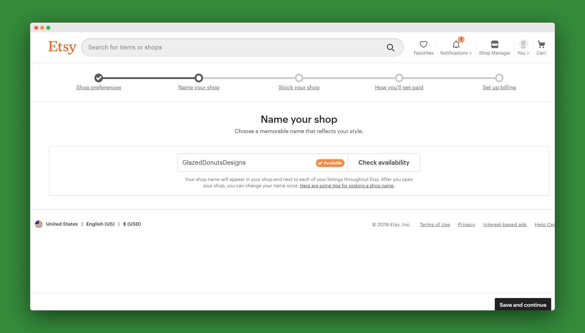 Choose your shop name: Follow the on-screen directions as you come up with your own shop name. Get creative with your shop name or pick something practical. It’s up to you as long as the name is available.
