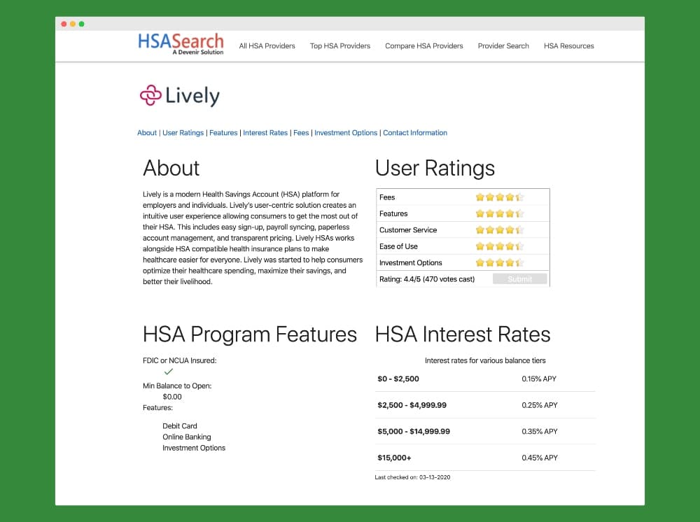 One of the best HSA accounts for both spending and investing is Lively. Lively is an online provider of HSA accounts for individuals and families.