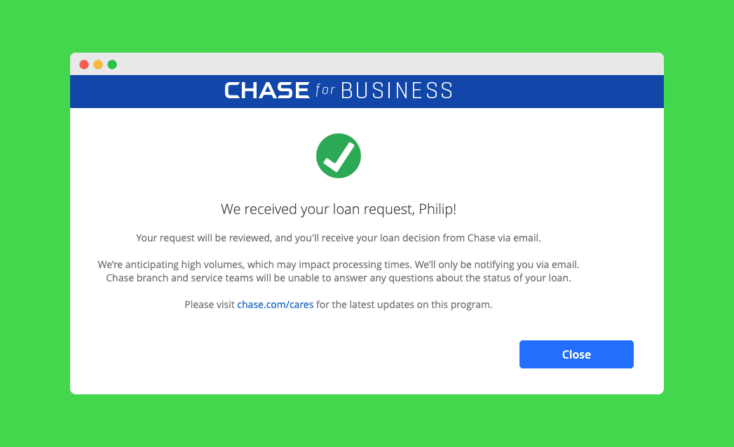 I have not been able to submit my application. But, I’ve placed myself into the Chase PPP “queue”. If you’re a Chase business customer you can head to https://recovery.chase.com/cares1/sba-loan-forgiveness and fill out the two page form. At the end, you’ll find out that Chase now needs to speak to you directly to complete the application. Here’s the screenshot:
