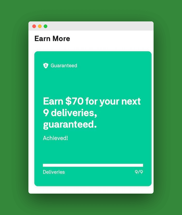Guaranteed earnings will give you a guaranteed minimum payout when you complete a minimum number of deliveries within a certain time period. (For example, you might earn a guaranteed $500 for 50 deliveries in a month).