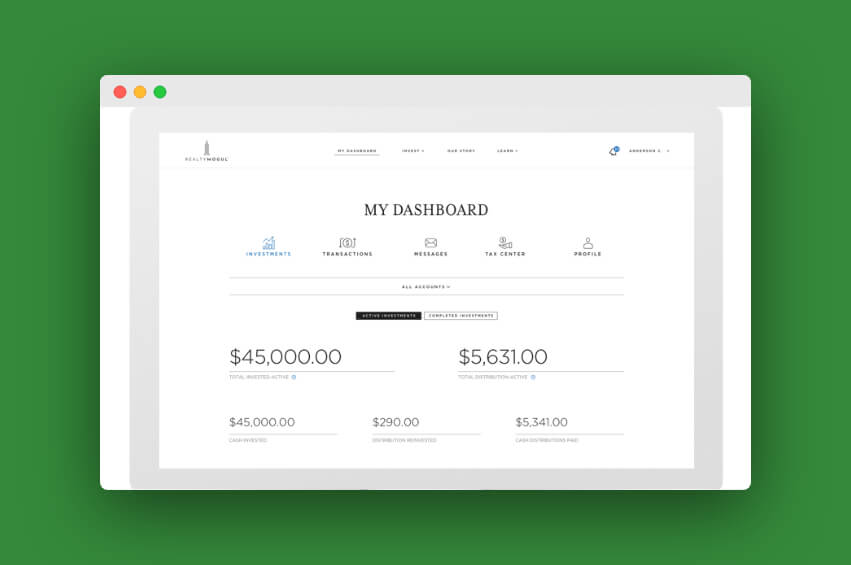 RealtyMogul’s dashboard allows you to track the performance of your investments and keep track of your distributions. The platform also produces and emails you quarterly investment reports and annual tax documents so you’ll always have the information you need.