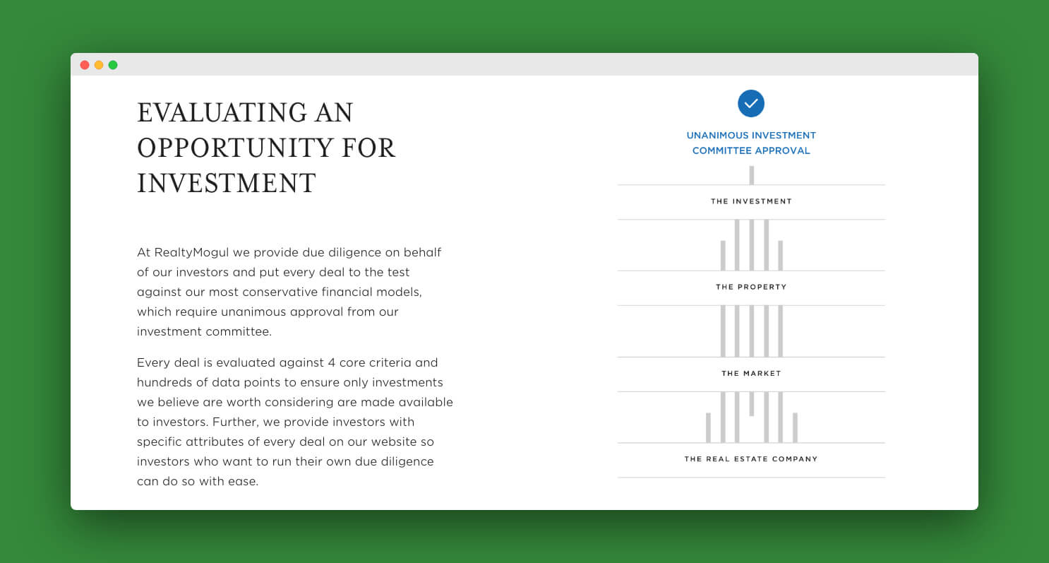 In either case, RealtyMogul does a remarkable amount of due diligence about the projects that it offers on its platform. The website states that, on average, RealtyMogul accepts only one real estate opportunity out of every 1,000 deals they scrutinize.