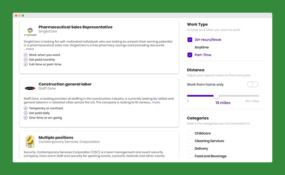 The app allows you to search for gigs using filters and lists both side hustles and micro-gigs all the way up to traditional jobs.