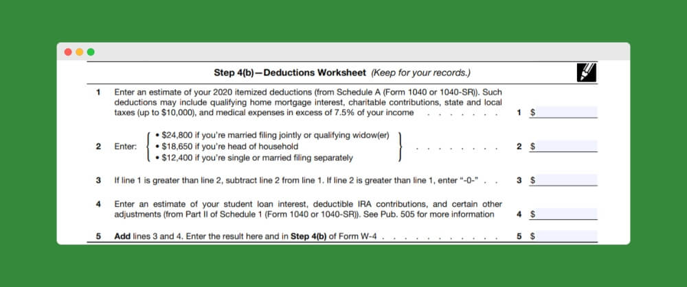 Do you plan to itemize your deductions instead of taking the standard deduction? If so, you can account for that in this step as well. To more accurately predict the deduction amount for itemizers, the W-4 has included a new “Deductions Worksheet” (also on page 3).
