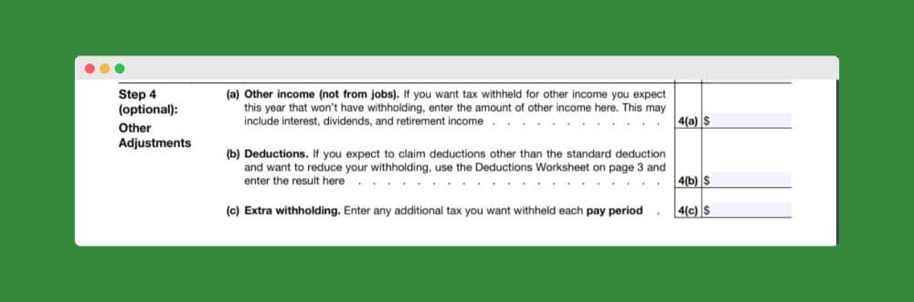 This fourth step is intended to account for less common income adjustments. In this step, you can direct your employer to withhold taxes for non-job income like interest and dividends.
