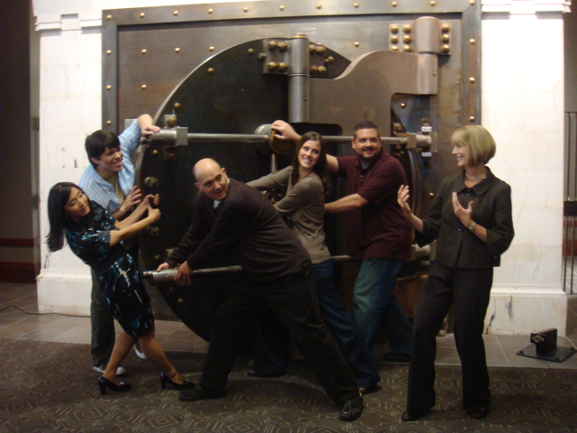 One of the shots was taken in front of a vintage bank vault. Here’s Liz encouraging us to steal money to meet our savings goals. 😉
